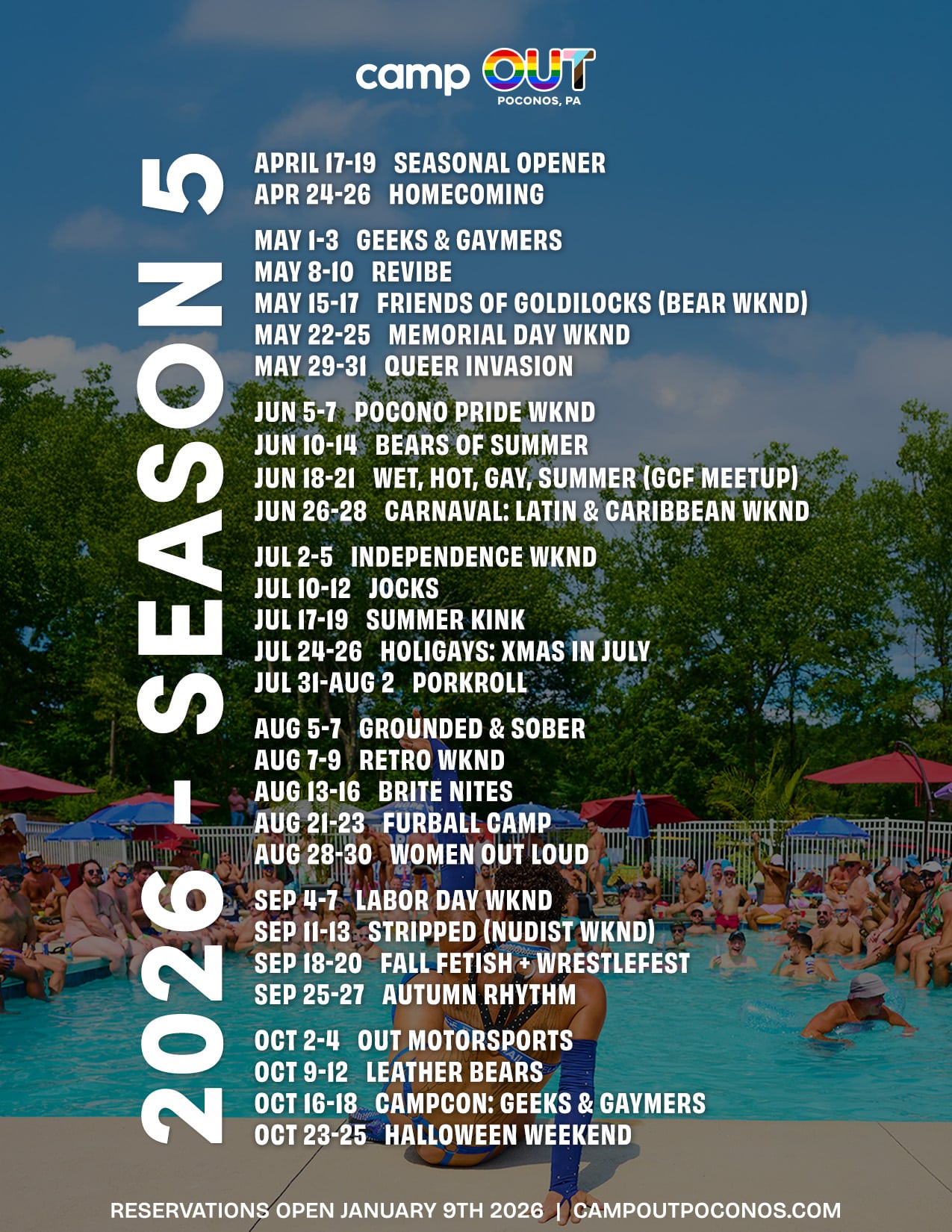 Camp Out is an adults-only, 21+ LGBTQ+ campground in the Pocono Mountains, just 90 minutes from NYC and Philly. Come for the pool parties, bonfires, nightlife, and Pride-filled weekends. Stay for the community.