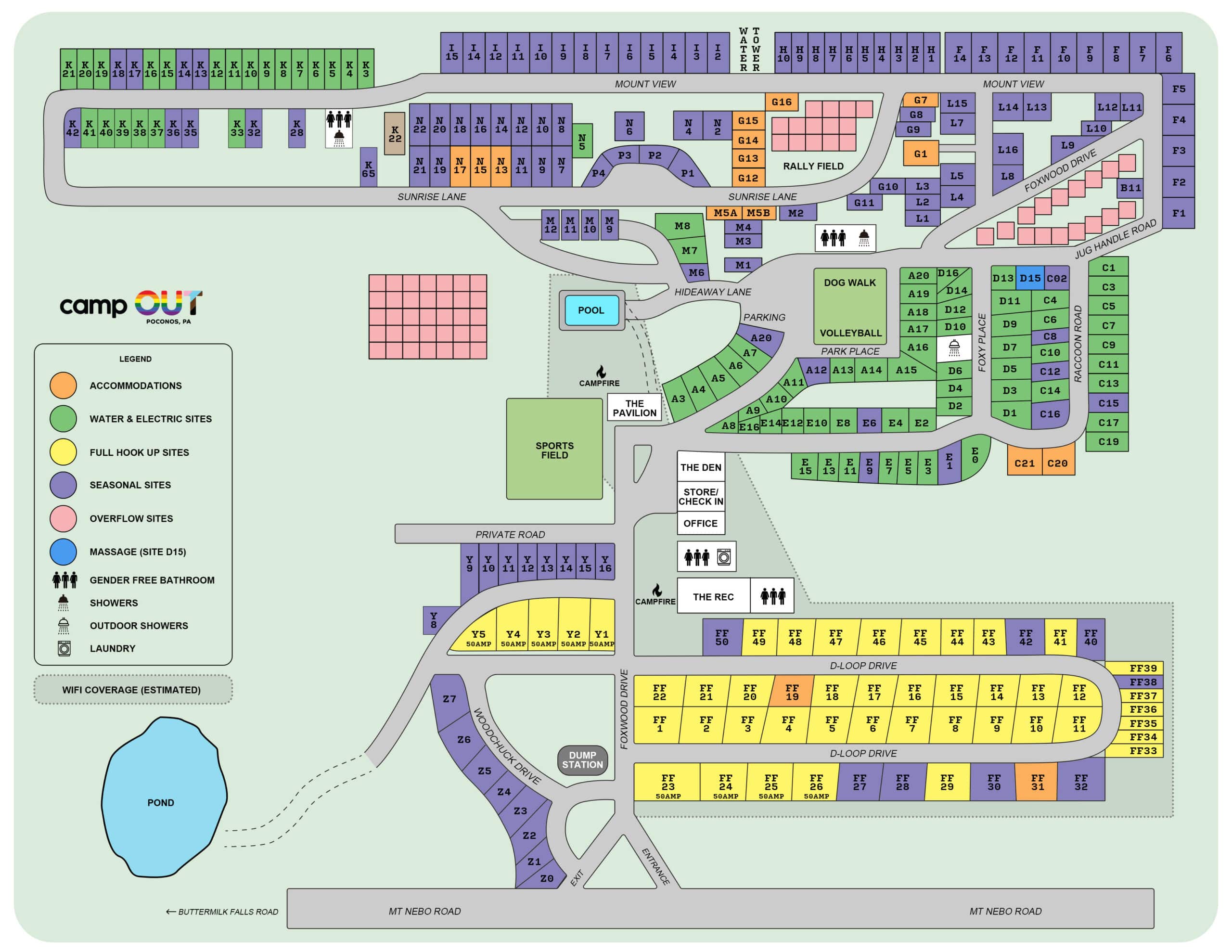 Explore the Camp Out map and get a feel for the grounds. Find cabins, campsites, and everything you need for your stay.